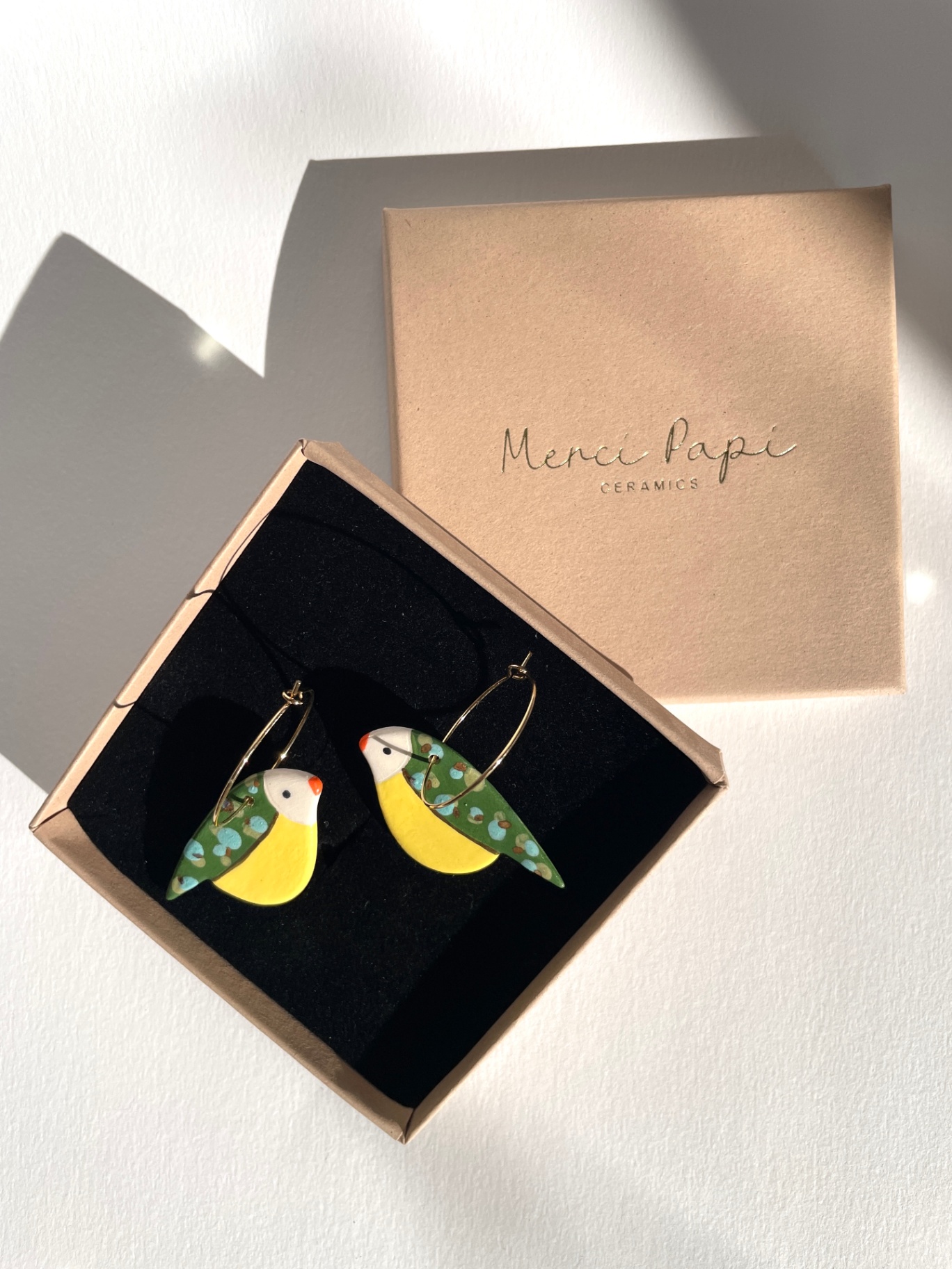Boucles d’oreilles en céramique : Oiseaux sur créoles dorées