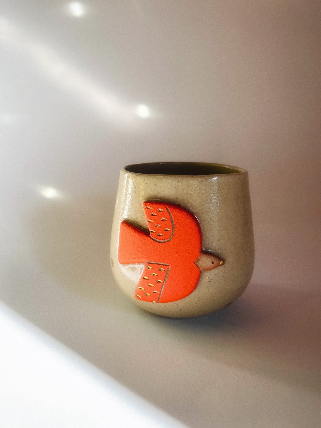 Sa taille plus contenue que celle du mug, met en valeur le décor : un oiseau stylisé, presque en mouvement, ponctué de détails dorés appliqués à la main.