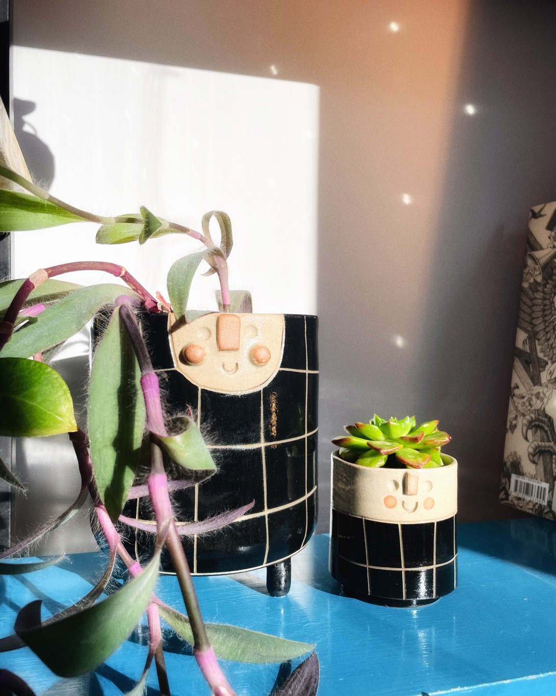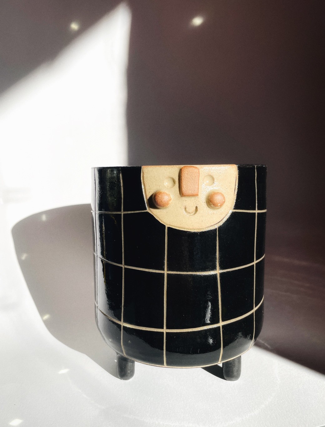 Ce cache-pot ou pot de fleur Wapi, est unique de par sa fabrication artisanale, chaque étape de fabrication est réalisée à la main, lentement et patiemment par mes soins. Et même si pour des raisons de production, je crée plusieurs Wapis à la fois, leur charme vient aussi du fait que je ne peux et ne souhaite pas les façonner de façon identique. Ce sera tantôt le positionnement de leurs nez ou la gravure de leurs bouches ou le graphisme des motifs ou encore de la façon que j’aurai d’émailler la pièce qui lui donnera son caractère singulier.